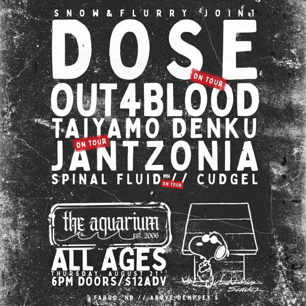 This Snow & Flurry joint also features hip hop & rap from Taiyamo Denku and Jantzonia on their final leg of tour. Along with the final stops for Spinal Fluid out of the Twin Cities and Cudgel!