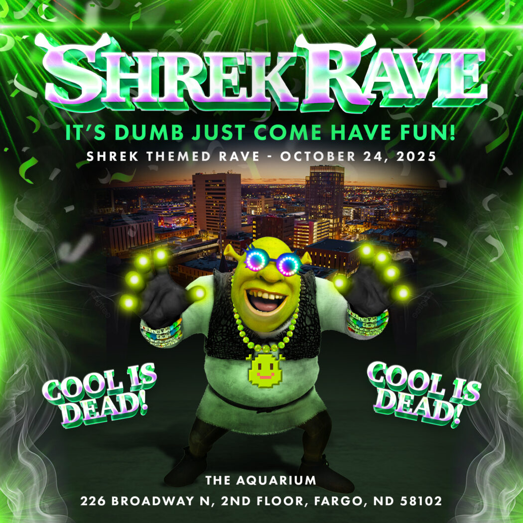 The Aquarium 226 Broadway N Fl 2, Fargo, ND, United StatesSHREK RAVEIT'S DUMB JUST COME HAVE FUN. WHO CARES. COOL IS DEAD. idk hahahaat The Aquarium9pm Doors21+$20 adv